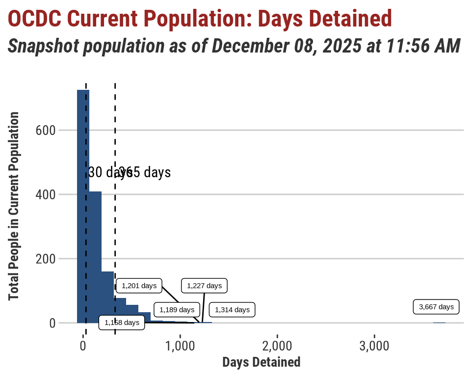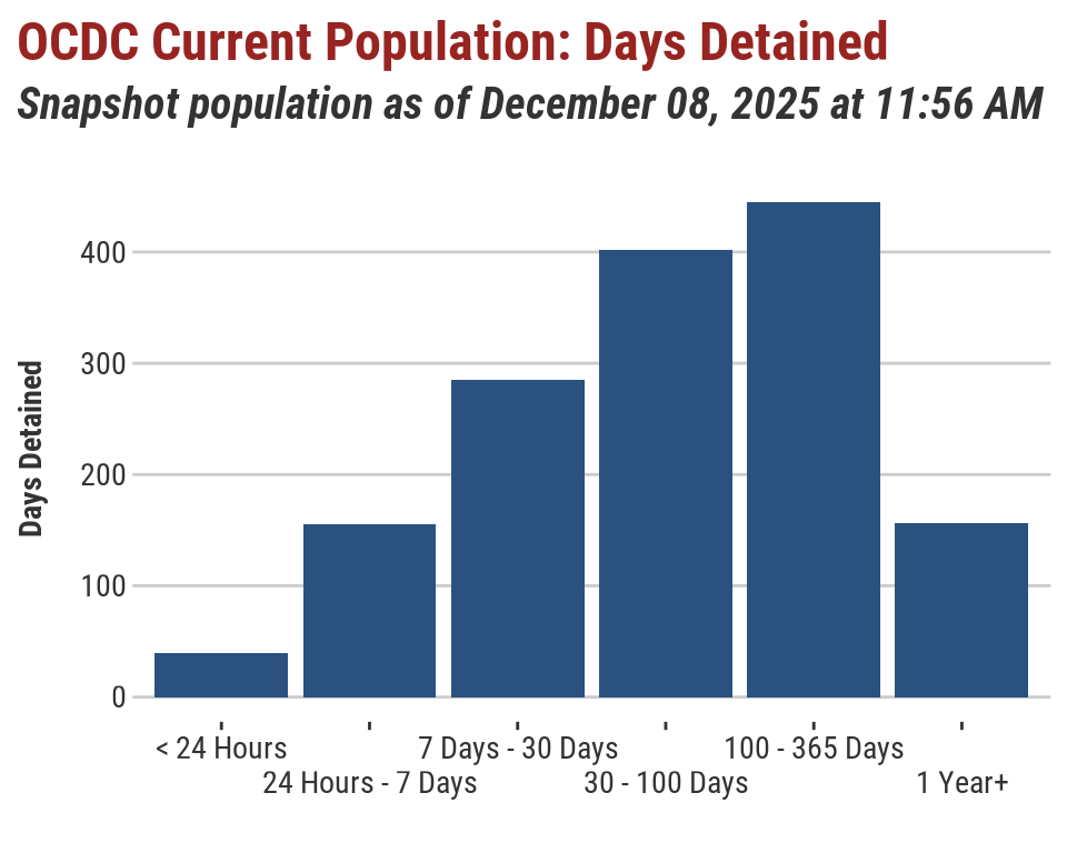 At the time of the last data update (December 08, 2025 at 11:56 AM), there were 1,484 people currently in OCDC custody. The graph below shows how long each of them have been in custody as of that time.